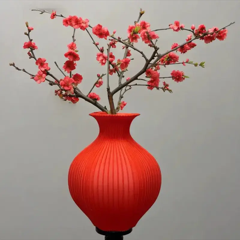 Our artisanal 3D printed Spring Festival vase captures the spirit of Chinese New Year through elegant craftsmanship. Featuring a vibrant orange-red body with subtle striped textures, it echoes traditional ceramic artistry. Designed to hold delicate plum blossoms—symbolizing resilience and hope in Chinese culture—it creates a warm, festive atmosphere ideal for welcoming spring. With a rounded shape and smooth finish achieved through advanced printing technology, this 25cm-tall vase fits perfectly on tabletops, mantels, or windowsills. It pairs beautifully with pink plum blossoms, sometimes adorned with a dusting of snow for a wintry charm. The design harmonizes nature and tradition, evoking tranquility and joy. Each detail reflects authentic cultural elements with modern appeal, making this vase both a decorative piece and a symbol of renewal and prosperity.